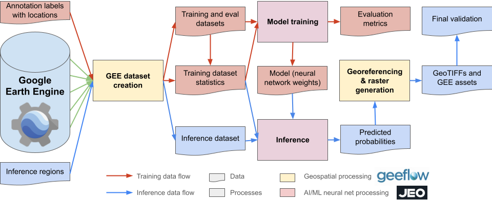Jeo is an open-source library developed by Google DeepMind for training machine learning models in geospatial remote sensing and Earth Observation (EO) applications. Built on JAX and Flax, Jeo offers a flexible and scalable framework designed to run seamlessly on CPUs, GPUs, and Google Cloud TPU VMs. Jeo provides a comprehensive set of tools for building, training, and evaluating models on large-scale geospatial datasets. It includes support for data loading, preprocessing, model definition, training loops, and evaluation metrics—all optimized for high performance and scalability.